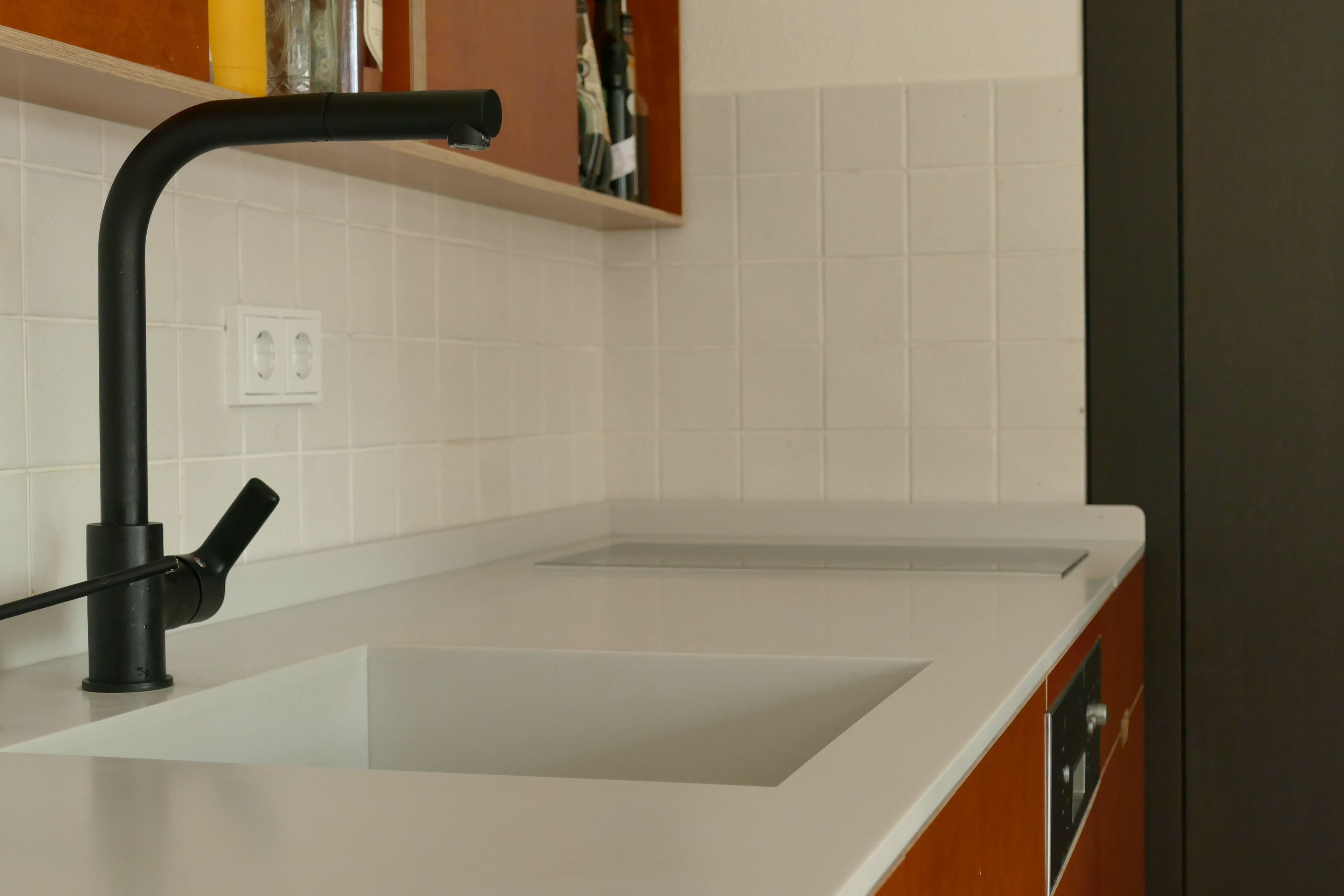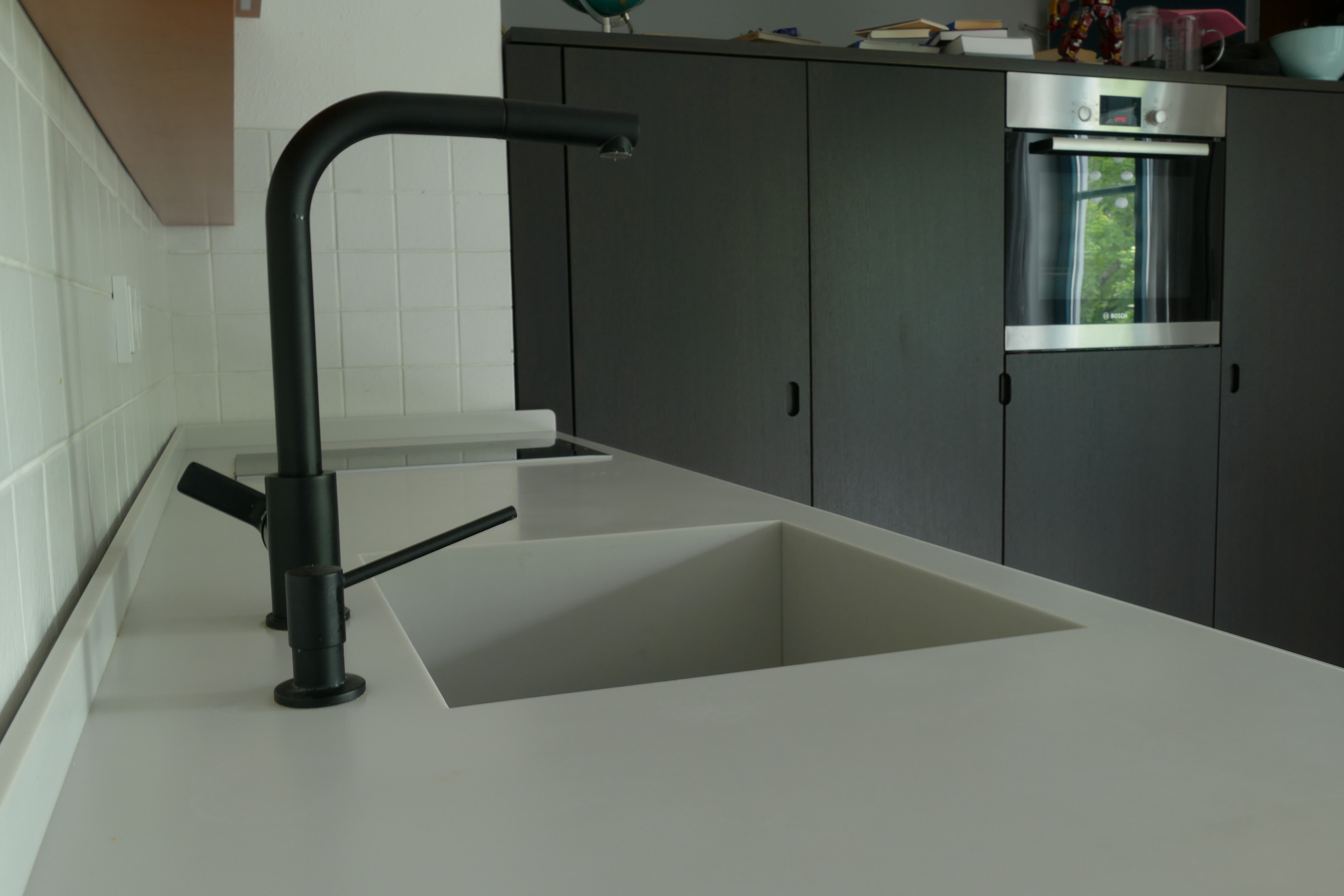 The kitchen's highlight is the Corian countertop, a natural material chosen for its thermal deformability and the seamless bonding technique that gives it a cohesive, integrated appearance.